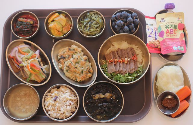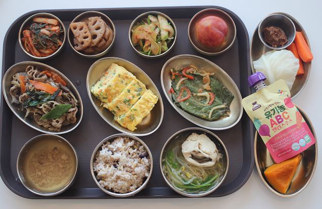 잡곡밥/맑은대구탕/우삼겹느타리볶음/야채계란말이/ 된장깻잎지/연근조림/오이부추무침/숙쌈*야채스틱/김치/추희자두 간식-유기농ABC쥬스/단호박찜