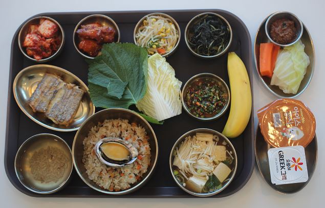 전복영양밥/미소된장국/토마토소스양념치킨/갈치구이/ 모듬쌈채소*쌈장/콩나물무침/건취나물/숙쌈*야채스틱/겉절이김치/바나나 간식-아이스홍시/그릭요거트