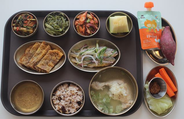 잡곡밥/녹두닭다리탕*녹두죽/조기야채찜/문어오이초무침/ 라이스페이퍼육전/미역줄기/숙쌈*야채스틱/열무김치/메론 간식-유기농쥬스/군고구마