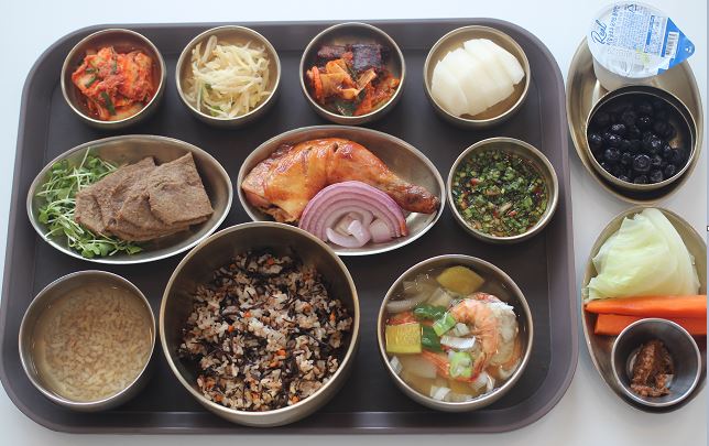 잡곡밥/서산개국지/톳비빔밥*양념장/닭다리오븐구이/부채살양념구이/ 순대볶음/숙쌈*야채스틱/도라지나물/김치/배 간식-요플레/블루베리