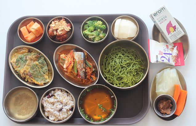 잡곡밥/모밀국수*모밀장국/깻잎육전/꽁치김치찜/마늘닭강정/ 브로콜리들깨무침/숙쌈*야채스틱/깍두기/참외 간식-국산콩두유/견과류