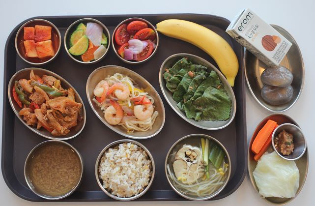 잡곡밥/맑은대구탕/돈육고추장불고기/새우팟타이/된장깻잎지/ 숙쌈*야채스틱/방울토마토마리네이드/애호박새우젓나물/깍두기/바나나 간식-국산콩두유/감자만두