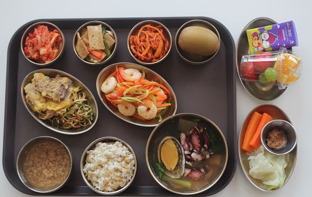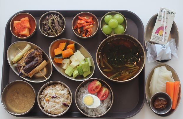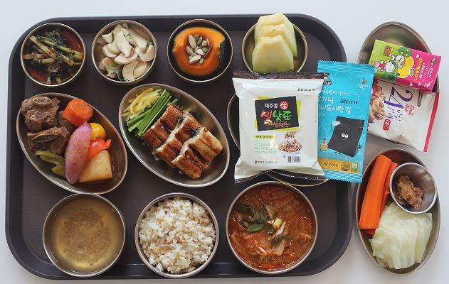잡곡밥/참치김치찌개/소갈비찜/장어구이*초생강/낫또/ 유기농김/야채스틱*숙쌈/미니단호박견과류찜/새송이버섯볶음/김치/메론 간식-골든사과쥬스/견과류