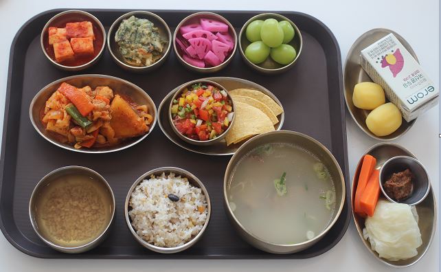 잡곡밥/설렁탕/고구마닭갈비/통밀또띠아*토마토살사소스/ 부추깻잎전/연근비트피클/야채스틱*숙쌈/깍두기/샤인머스캣 간식-국산콩두유/찐감자