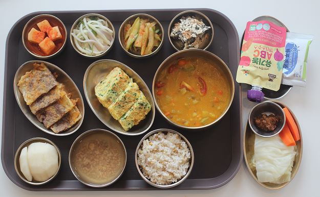 잡곡밥/렌틸콩카레소스/라이스페이퍼육전/부추계란말이/김부각/ 숙쌈*야채스틱/오이피클/감자채볶음/깍두기김치/배 간식-유기농ABC쥬스/하루견과