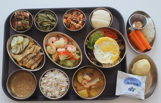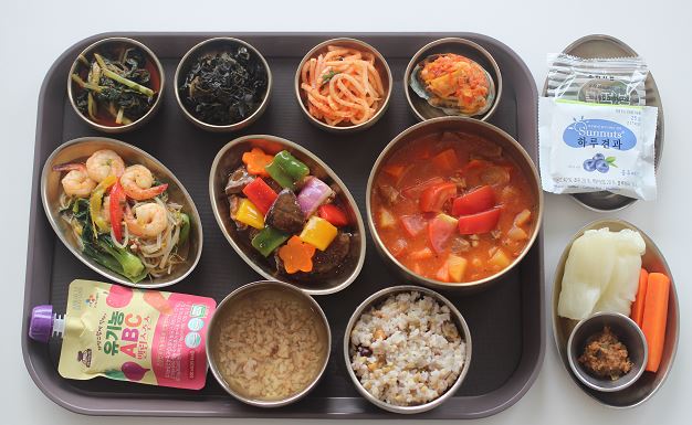 잡곡밥/헝가리굴라시/새우팟타이/표고탕수/전복치즈구이/ 미역초무침/무생채무침/숙쌈*야채스틱/열무김치/유기농ABC쥬스 간식-하루견과/쑥떡