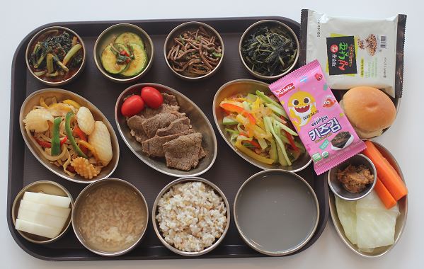 잡곡밥/검정콩국물/소고기양념구이/해물두부면볶음/ 해파리냉채/건취나물/호박지짐*양념장/숙쌈*야채스틱/열무김치/배 간식-모닝롤/낫또*조미김