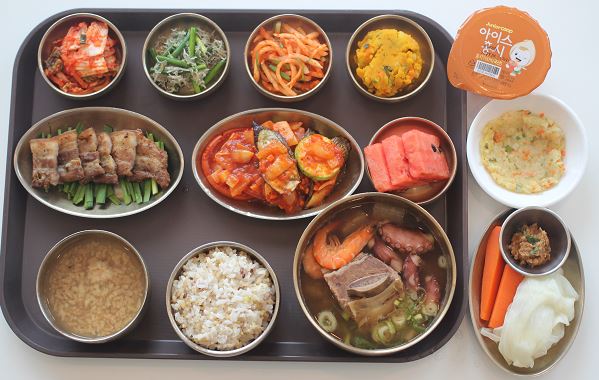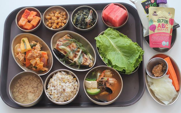 잡곡밥/새우해물탕/삼치구이/춘천닭갈비/상추쌈/건시래기지짐/ 병아리콩조림/숙쌈*야채스틱/깍두기김치/수박 간식-낫또/유기농ABC쥬스