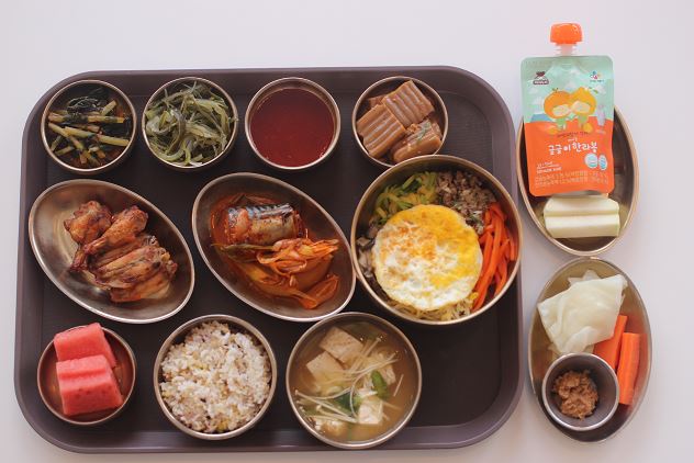 한식비빔밥/두부장국/고등어무조림/닭봉*윙오븐구이/미역줄기볶음/ 도토리묵김치무침/숙쌈*야채스틱/열무김치/수박 간식-한라봉쥬스/콜라비스틱