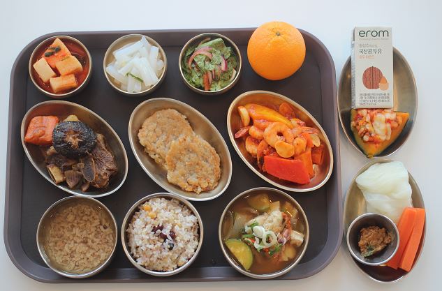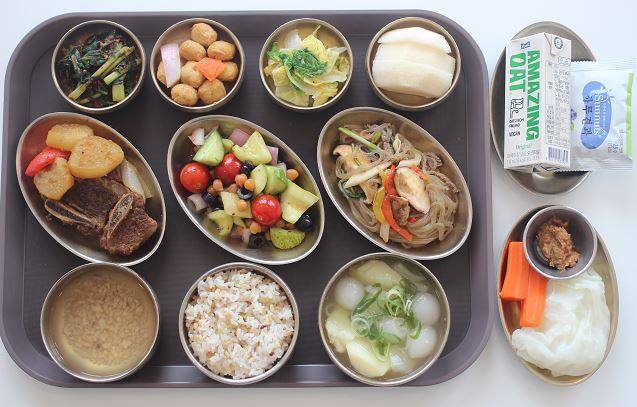 잡곡밥/감자옹심이국/소갈비찜/한식잡채/쉬라즈샐러드/ 볼어묵볶음/배추나물/숙쌈*야채스틱/열무김치/배 간식-비건오트음료/하루견과