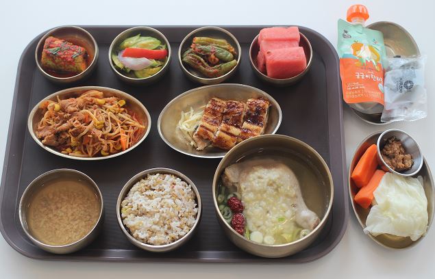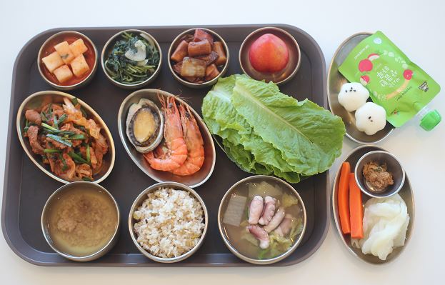 잡곡밥/낙지연포탕/오리주물럭볶음/전복*새우구이/ 모듬쌈채/숙쌈*야채스틱/짜장떡볶이/깻잎순나물/깍두기김치/자두 간식-사과쥬스/기정떡