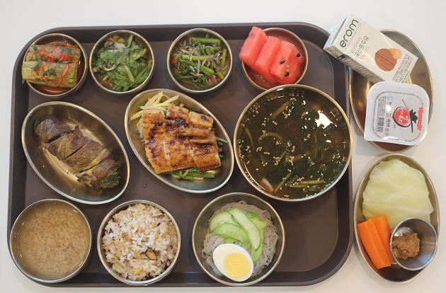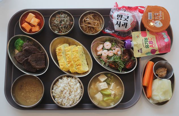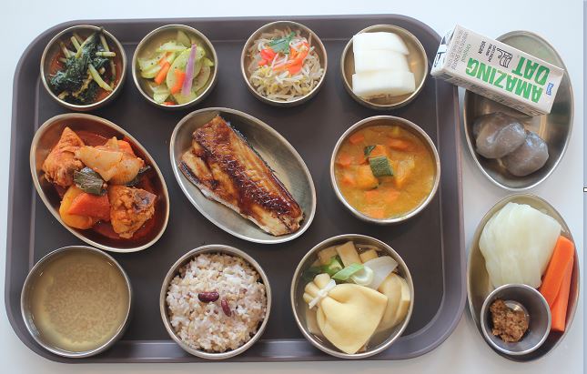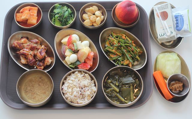 잡곡밥/시래기된장국/닭다리살스테이크/옛날사라다/ 부추오이무침/청경채나물/나물조림/야채스틱*숙쌈/깍두기김치/천도복숭아 간식-국산콩두유/견과류