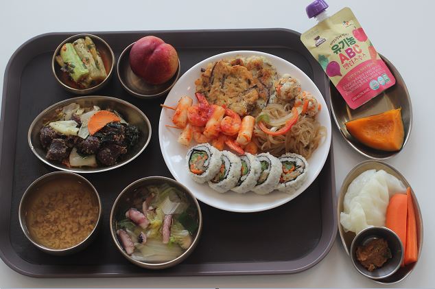 김밥/낙지연포탕/새우떡꼬치구이/녹두전/순대볶음/ 잡채/야채스틱*숙쌈/오이지김치/천도복숭아 간식-유기농ABC쥬스/단호박찜