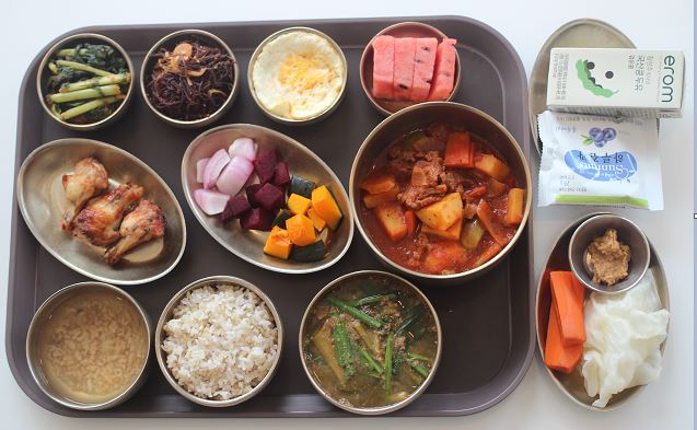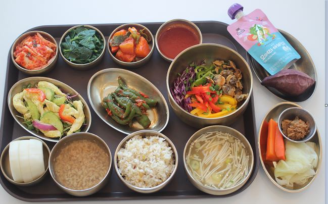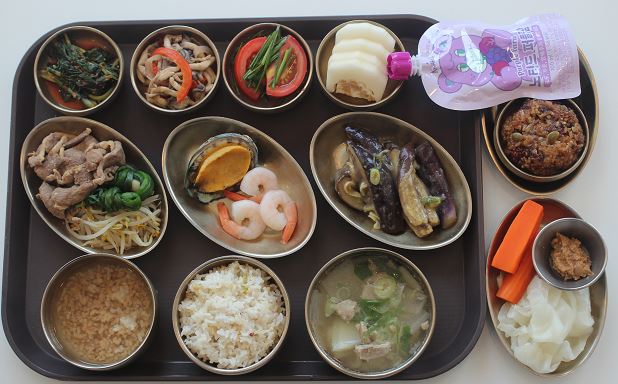 잡곡밥/소고기무국/오리고기야채찜/전복*새우구이/숙쌈*야채스틱/ 토마노영양부추무침/쌀가루가지찜/느타리들깨가루무침/갓김치/참외 간식-과일쥬스/수제약식