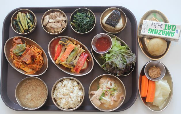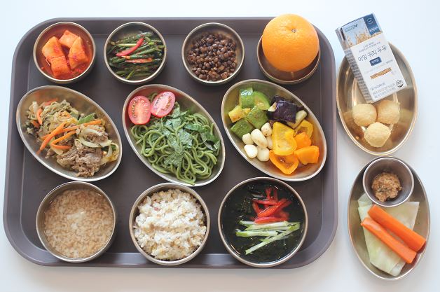 잡곡밥/오이미역냉국/김치소불고기/모밀깻잎뮘/모듬야채구이/ 숙쌈*야채스틱/렌틸콩조림/부추무침/김치/오렌지 간식-귀리두유/떡
