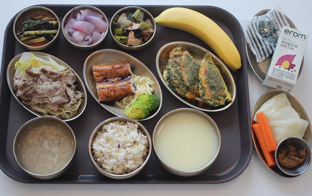 잡곡밥/콩국물/차돌야채찜/민물장어구이/깻잎고기전/ 숙쌈*야채스틱/표고버섯볶음/적양파구이/열무김치/바나나 간식-국산콩두유/쑥떡