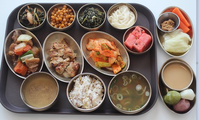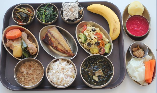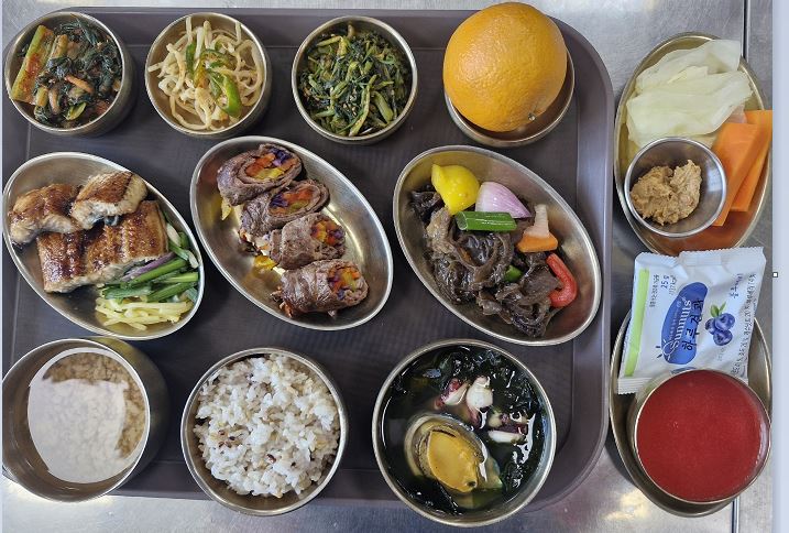잡곡밥/전복미역국/소고기말이/장어구이/목이버섯야채잡채/ 진미채무침/미나리나물/숙쌈*야채스틱/갓김치/오렌지 간식-해독쥬스/하루견과