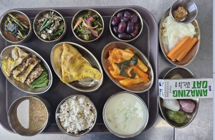 잡곡밥/미니콩국물/육전*영양부추/카레가자미구미/어묵떡볶임/ 멸치볶음/도토리묵야채무침/야채스틱*숙쌈/김치/포도 간식-떡/비건오트음료