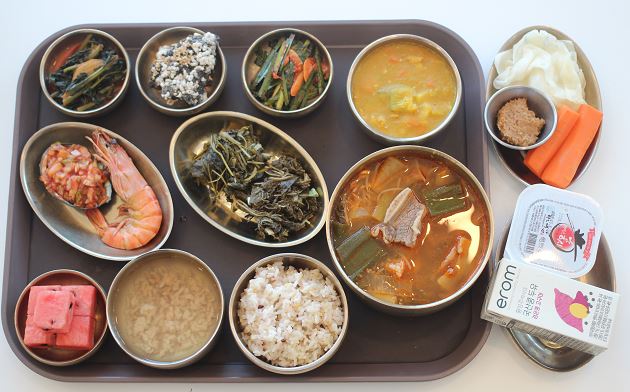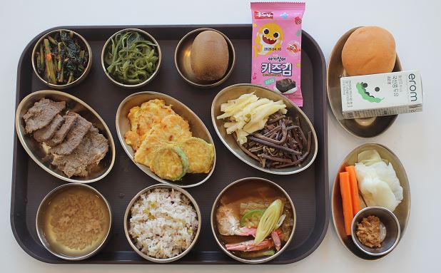 잡곡밥/서산개국지/부채살구이/동태*호박전/고사리*도라지나물/ 무조미김/미역줄기볶음/갓김치/샤채스틱*숙쌈/골드키위 간식-국산콩두유/모닝롤
