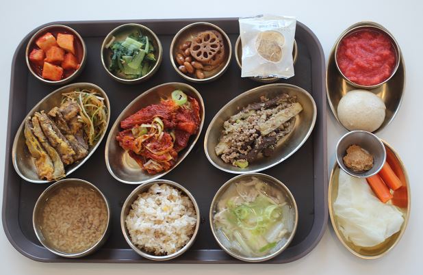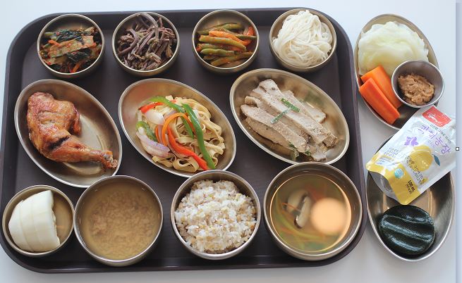 잡곡밥/닭곰탕/육전*파채무침/황태포고추장구이/가지민찌볶음/ 연근땅콩조림/얼갈이된장나물/숙쌈*야채스틱/깍두기/콩떡 간식-해독쥬스/찐빵