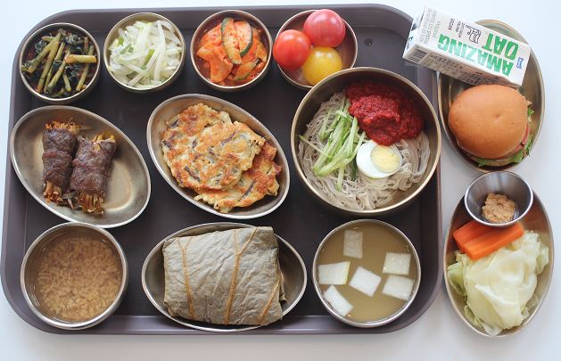 연잎밥/ 비빔냉면/소고기말이찜/녹두전/위소라야채볶음/ 숙쌈*야채스틱/냉면동치미/무나물/열무김치/캔디방울토마토 간식-비건오트음료/모닝롤