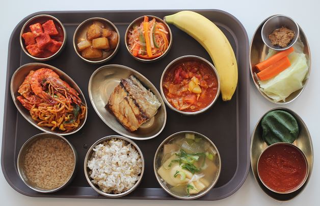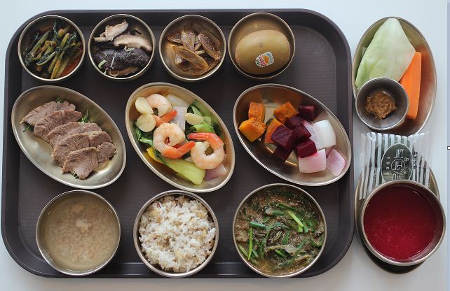 잡곡밥/추어탕/아롱사태수육찜/새우살청경채볶음/숙쌈*야채스틱/ 야채찜/표고버섯무침/우엉조림/열무김치/골드키위 간식-해독쥬스/쑥덕