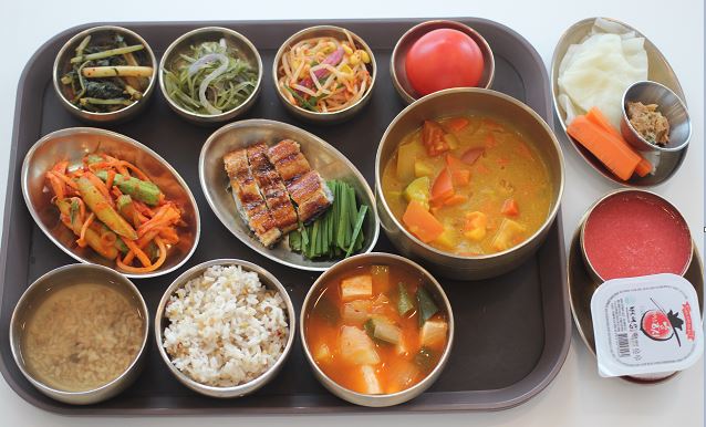 잡곡밥/감자고추장찌게/토마토카레/장어구이/숙쌈*야채스틱/ 오이도라지무침/콩나물무침/미역줄기/포기김치/열무김치/토마토 간식-해독쥬스/아이스홍시