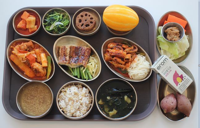 잡곡밥/황태미역국/고구마닭갈비/낙지볶음*소면/장어구이/ 숙쌈*야채스틱/연근조림/참나물무침/포기김치/참외 간식-국산콩두유/고구마구이