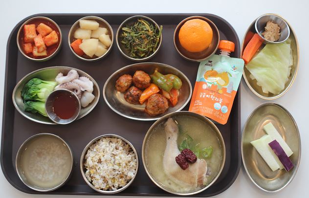 잡곡밥/한방닭백숙*찹쌀녹두죽/수제미트볼토마토소스조림/ 쭈꾸미쳥경채초회/야채스틱*숙쌈/감자조림/미나리나물/깍두기/카라향 간식-한라봉쥬스/콜라비스틱
