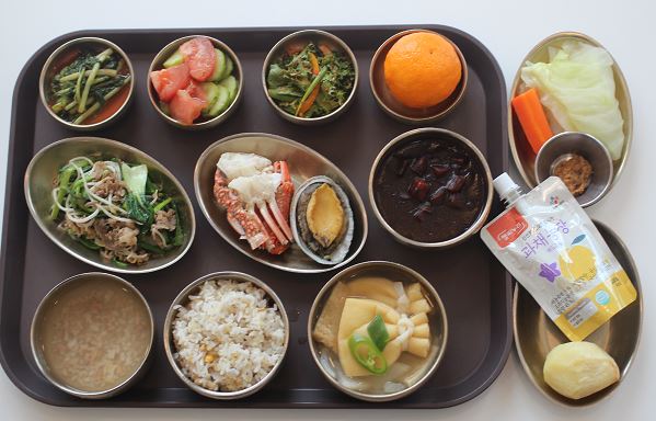 잡곡밥/유부주머니어묵국/우삼겹숙주볶음/전복*꽃게찜/ 자장소스/토마토오이마리네이드/치커리겉절이/포기김치/카라향 간식-배도라지즙/구운감자