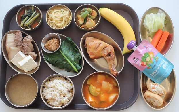 잡곡밥/감자고추장찌개/돈육보쌈*온두부/숙쌈*야채스틱/ 장각구이/데친케일쌈/도라지나물/오이고추된장무침/김치/바나나 간식-과채쥬스/유부초밥