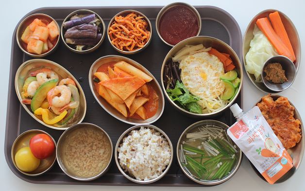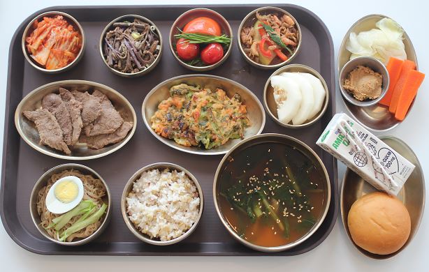 잡곡밥/열무냉면/된장국/부채살구이/해물파전/토마토영양부추무침/ 숙쌈*야채스틱/건새우무조림/고사리나물/포기김치/참외 간식-비건오트음료/모닝롤
