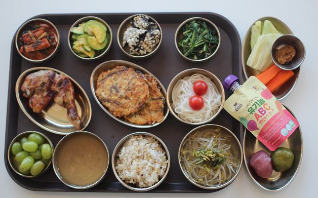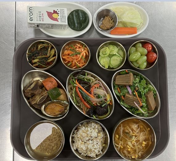 잡곡밥/얼큰김치콩나물국/비건잡채/전복소갈비찜/ 도토리상추무침/무생채/오이무침/숙쌈*야채스틱/무김치/방울토마토*포도 간식-국산콩두유/쑥떡