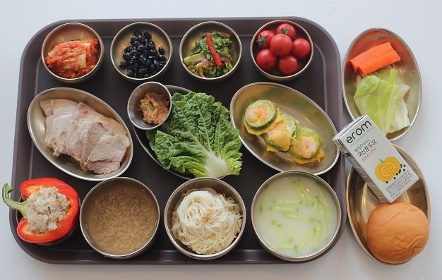 잡곡밥/콩국수/돈육보쌈/모듬쌈추/호박새우전/ 숙쌈*야채스틱/치커리무침/검정콩조림/포기김치/파프리카밥/방울토마토 간식-국산콩두유/모닝롤