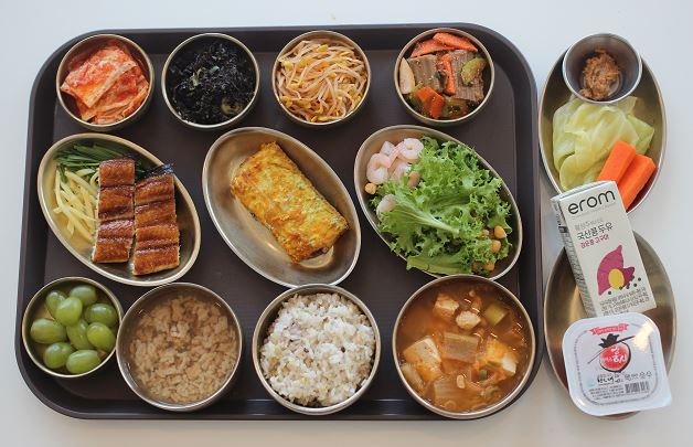 잡곡밥/청국장찌게/병아리콩새우샐러드/장어구이*생강채/ 갈치카레구이/도토리묵오이무침/숙쌈*야채스틱/건파래무침/포기김치/포도 간식-국산콩두유/아이스홍시