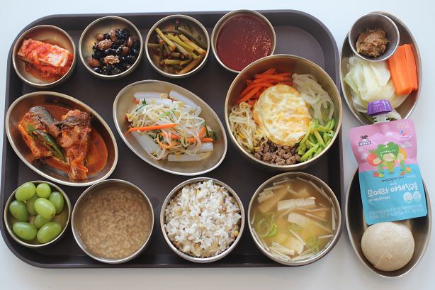 한식비빔밥*고추장/계란후라이/팽우두부장국/고등어무조림/탕평채/ 숙쌈*야채스틱/땅콩조림/마늘쫑볶음/포기김치/청포도 간식-유기농쥬스/찐빵