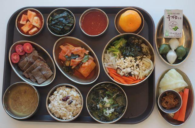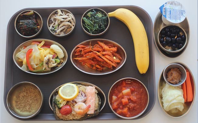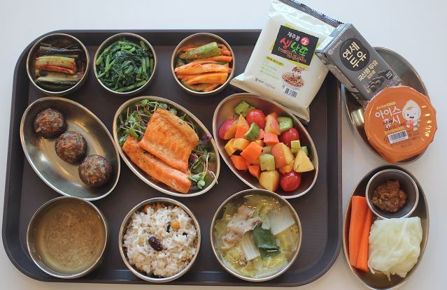 잡곡밥/항암배추전골/표고버섯떡갈비/연어된장구이/과일사라다/ 오이도라지초무침/얼갈이나물/숙쌈*야채스틱/제주콩생낫또/갓김치 간식-국산콩두유/아이스홍시
