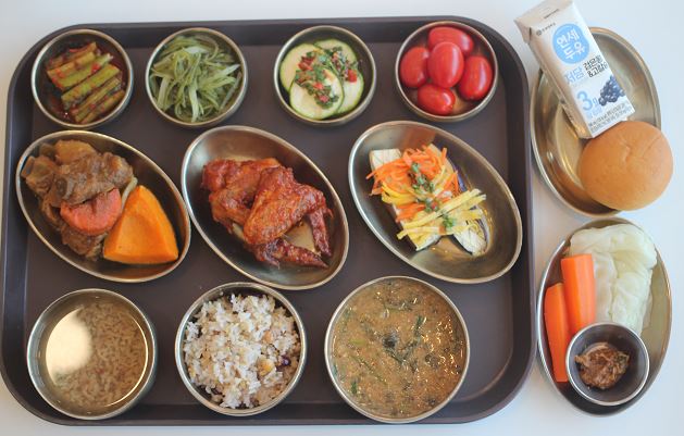 잡곡밥/소갈비육개장/안동찜닭/소고기두부완자구이/ 도라지*고사리나물/컬리플라워나물/김부각/깍두기김치/과일 간식-증편/저당두유