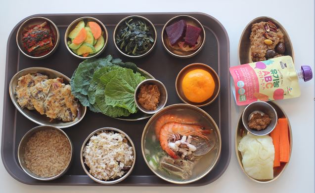 잡곡밥/갈낙새탕/녹두전/쌈채소*쌈장/연근*비트조림/ 숙쌈*야채스틱/곤드레나물/무생채/갓김치/귤 간식-수제약식/유기농ABC쥬스