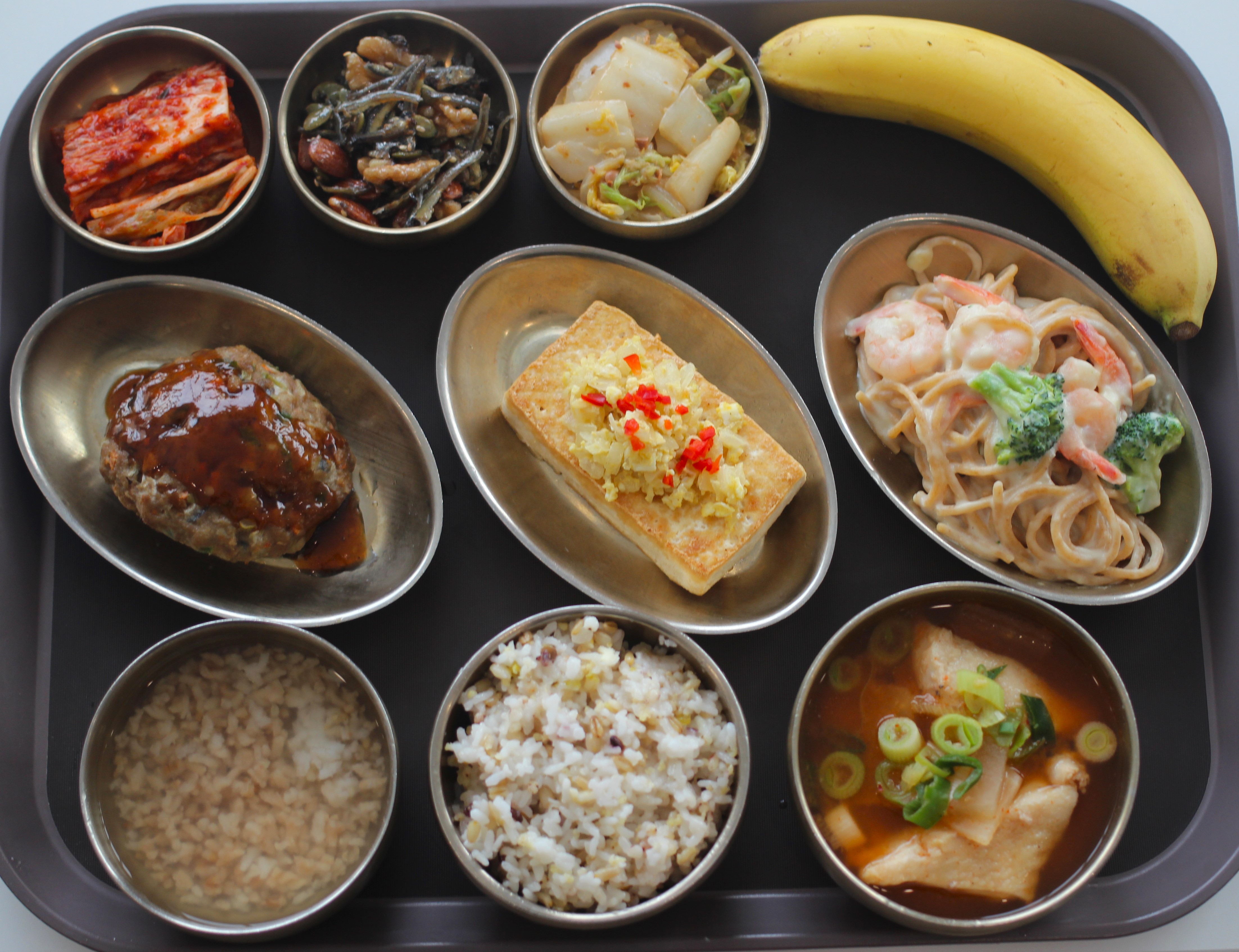 잡곡밥 / 가자미매운탕 / 수제떡갈비 / 흑백요리사파스타 / 황금두부 / 잔멸치견과류볶음 / 배추나물 / 김치 간식 : 바나나