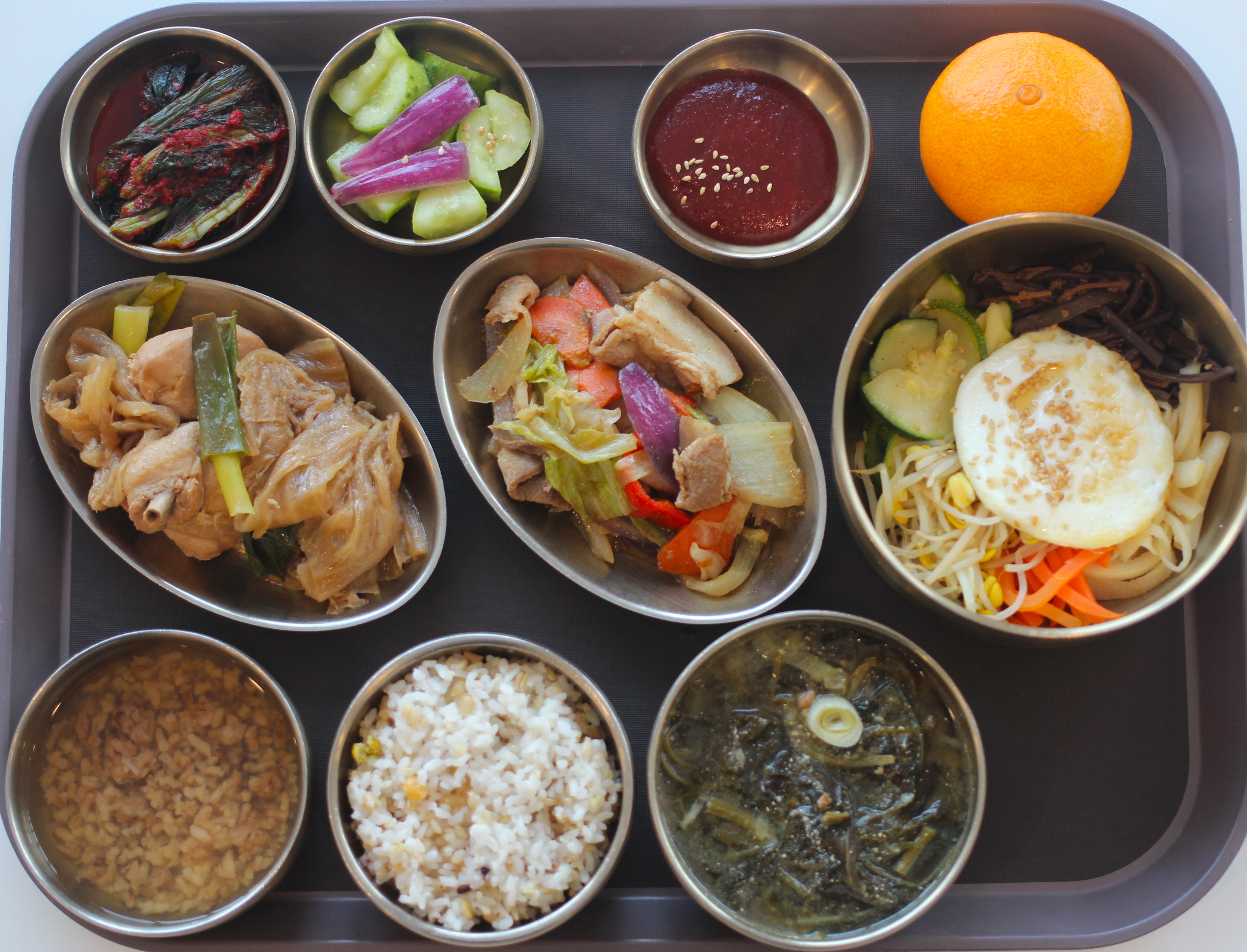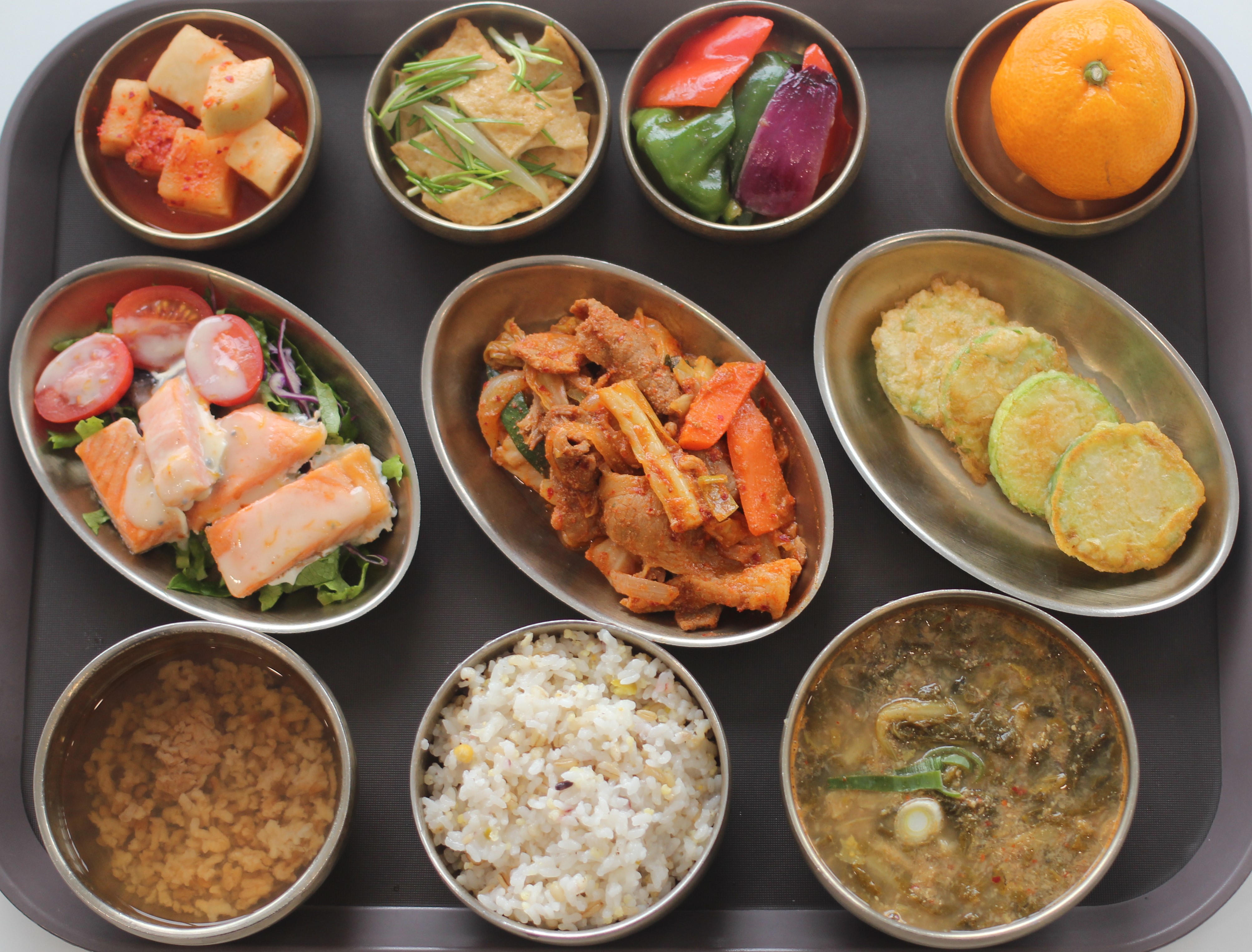 잡곡밥 / 추어탕 / 애호박전 / 연어카나페 / 제육볶음 / 파프리카볶음 / 어묵볶음 / 김치 간식 : 귤