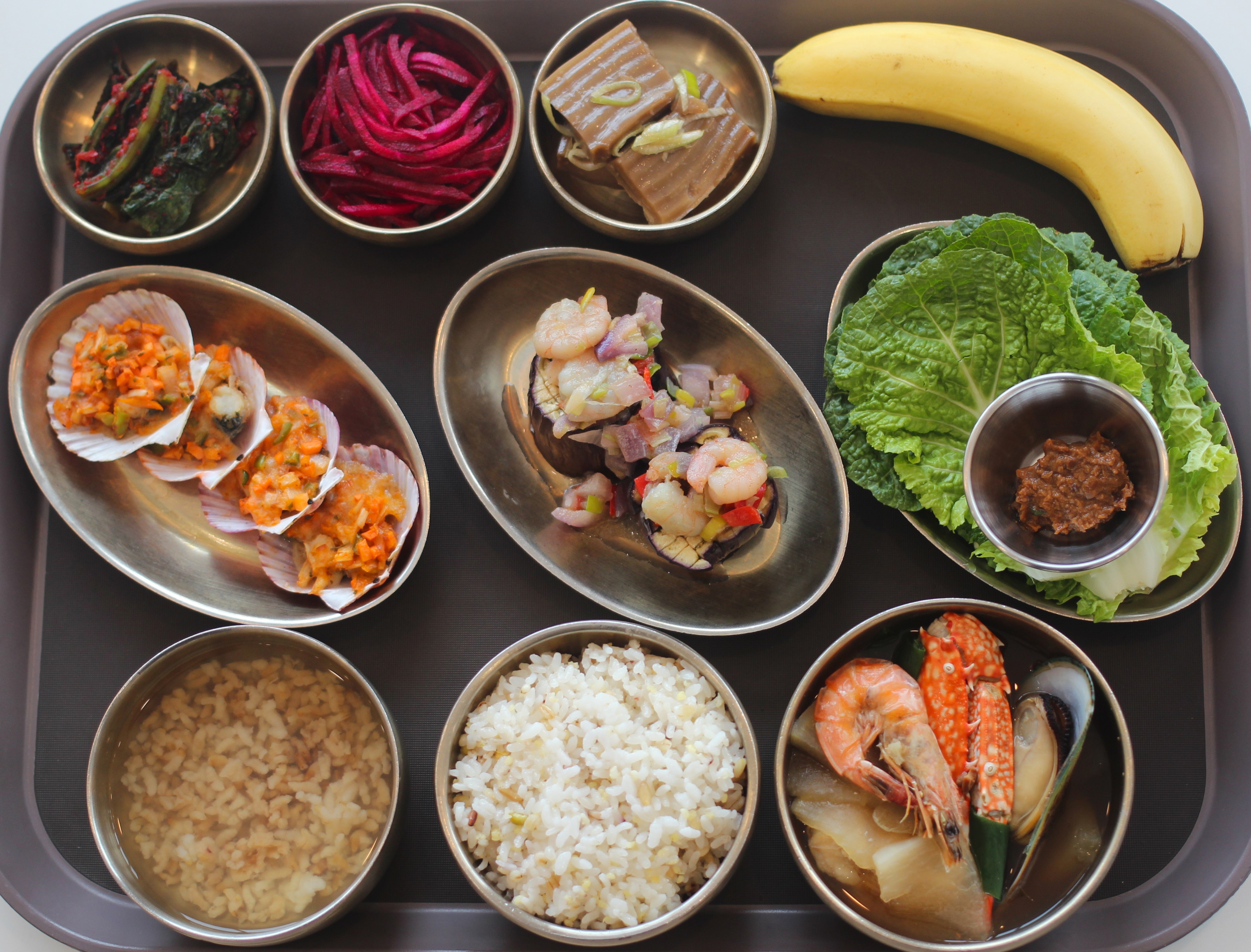 잡곡밥 / 해물된장찌개 / 가리비야채구이 / 어향가지새우조림 / 봄동쌈*쌈장 / 비트채볶음 / 도토리묵무침 / 김치 간식 : 바나나