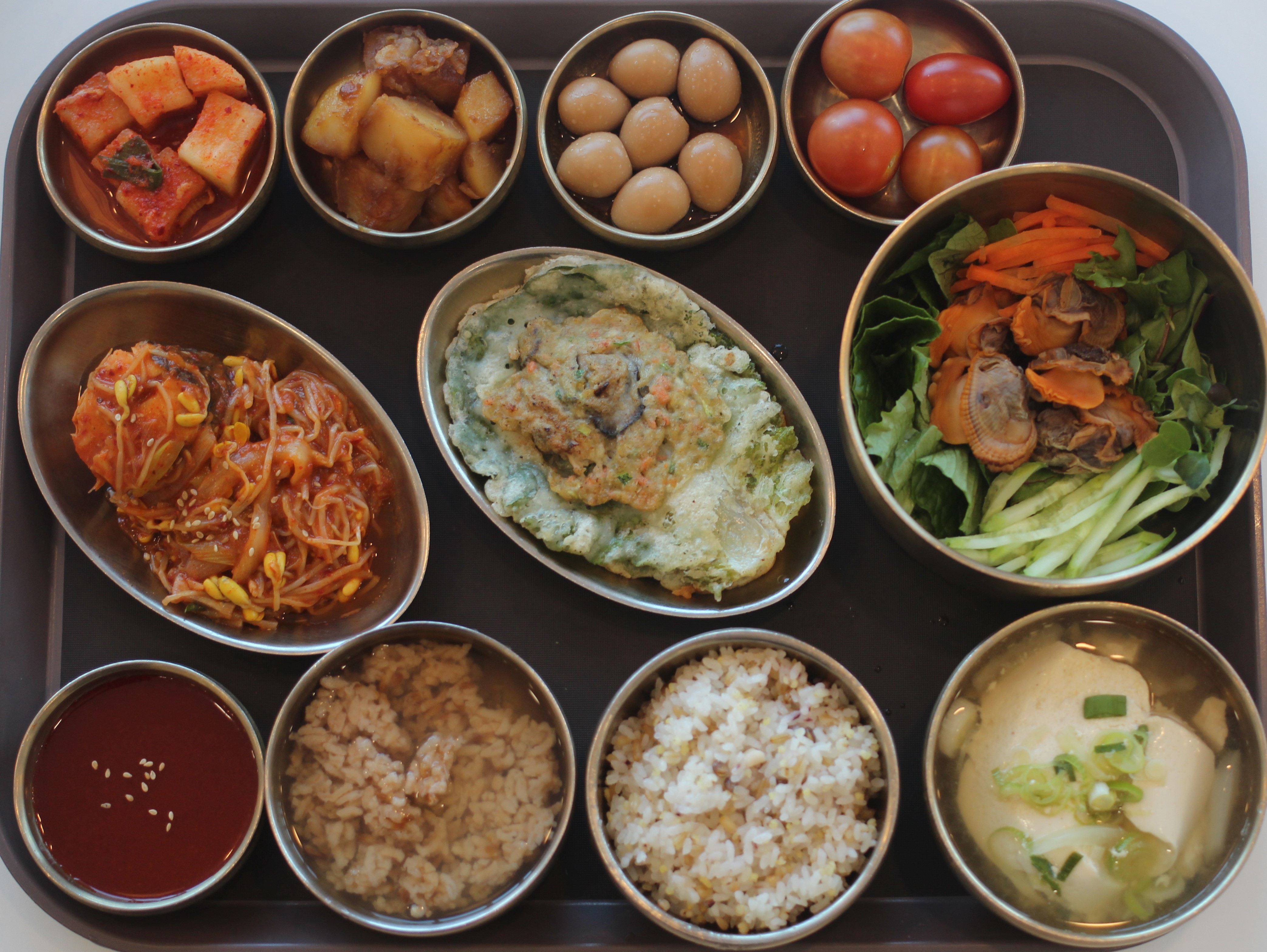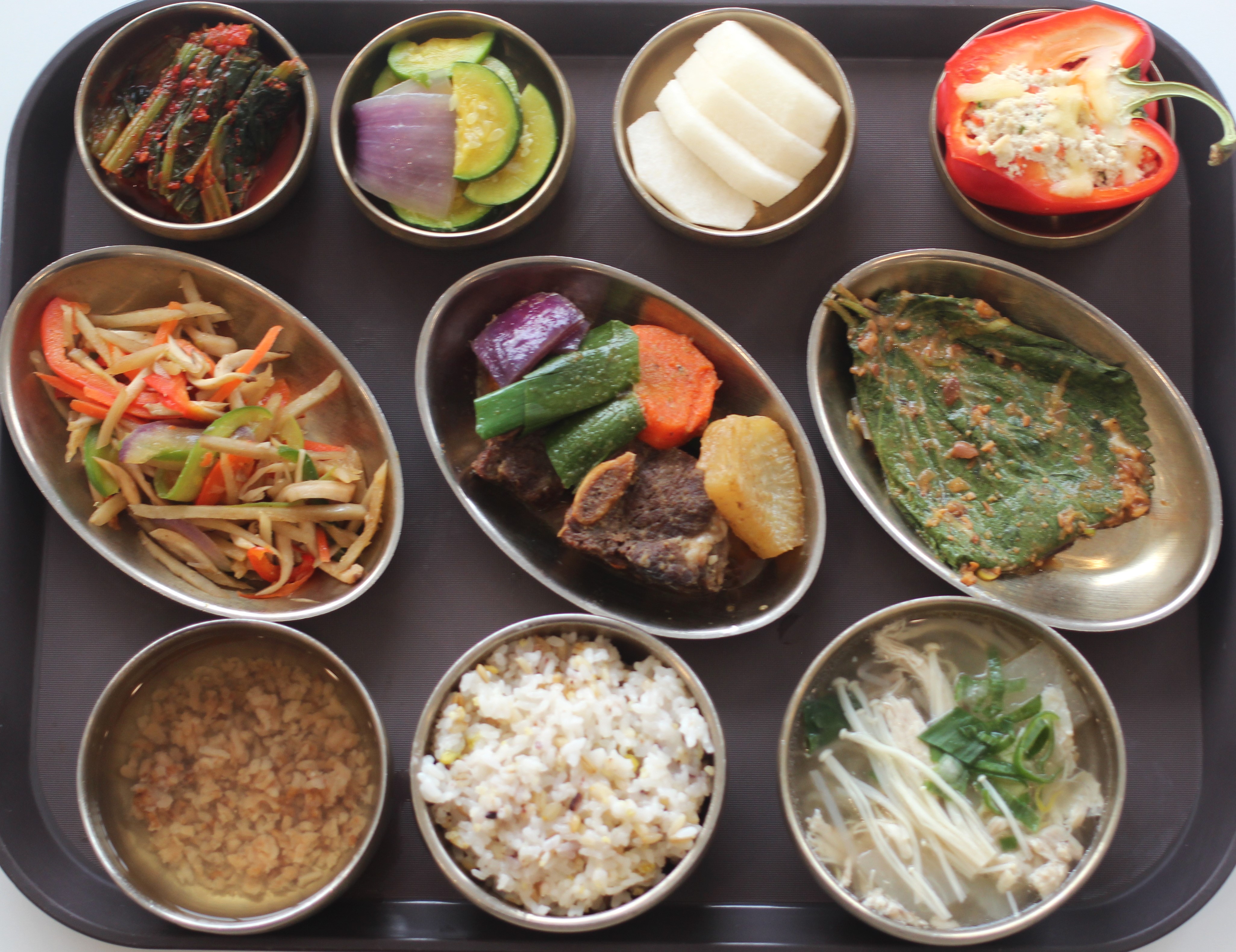 잡곡밥 / 닭샤브샤브 / 소갈비찜 / 우엉잡채 / 파프리카두부밥 / 깻잎지 / 호박나물 / 김치 간식 : 배