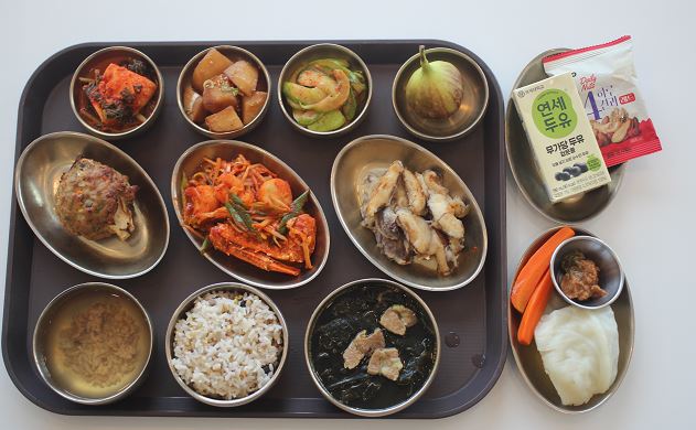 잡곡밥/소고기미역국/새송이떡갈비구이/꽃게해물콩나물찜/ 감자조림/숙쌈*야채스틱/표고찹쌀구이/오이초무침/무김치/무화과 간식-견과류/무가당두유