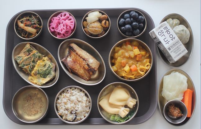 잡곡밥/유부주머니전골/노르웨이고등어구이/깻잎육전/카레우동 /전복밤조림/연근비트초절임/야채스틱*숙쌈/겉절이김치/포도 간식-감자만두/약콩두유