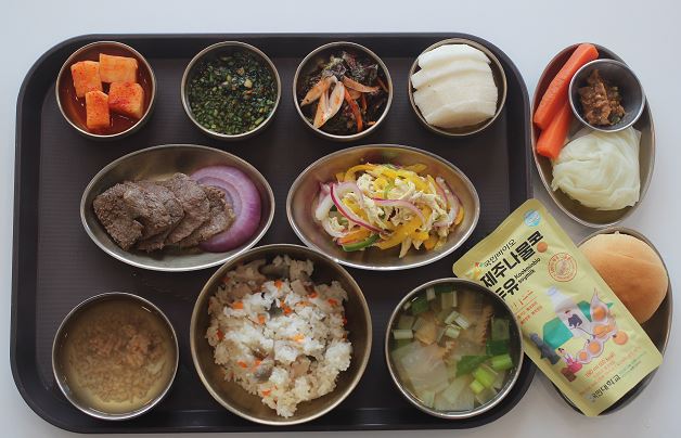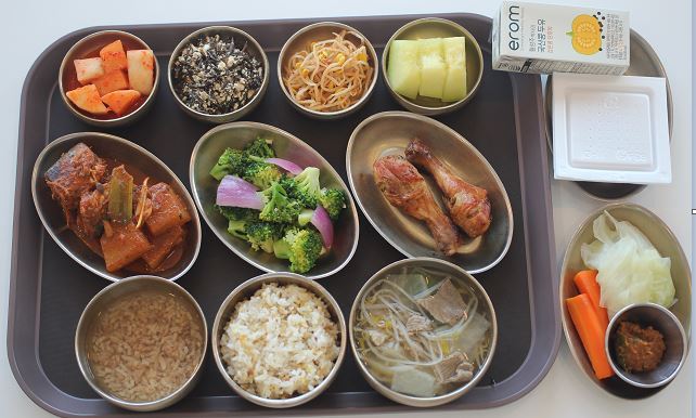 잡곡밥/맑은나주곰탕/닭다리오븐구이/꽁치구이/ 톳두부무침/콩나물무침/숙쌈*야채스틱/깍두기/메론 간식-제주콩낫또/국산콩두유