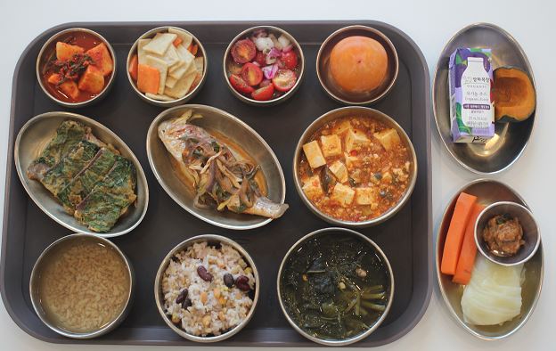 잡곡밥/건새우아욱된장국/깻잎육전/조기양념찜/가지마파두부/ 사각어묵야채볶음/숙쌈*야채스틱/방울토마토마리네이드/깍두기/홍시 간식-유기농쥬스/단호박찜