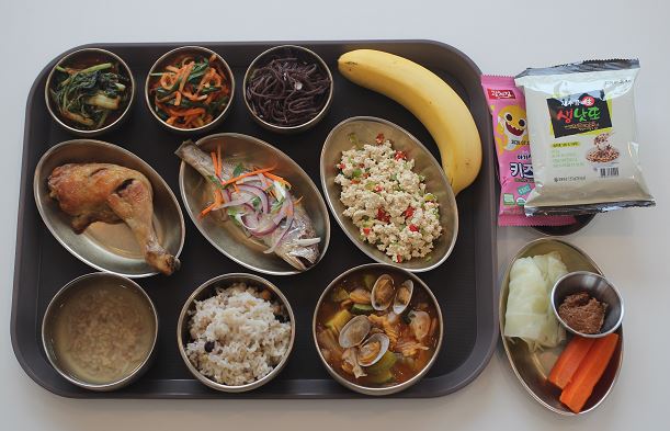 잡곡밥/바지락고추장찌게/닭다리오븐구이/두부소보로/ 조기구이/꼬시래기/무생채/숙쌈*야채스틱/김치/바나나 간식-제주콩생낫또/무조미김
