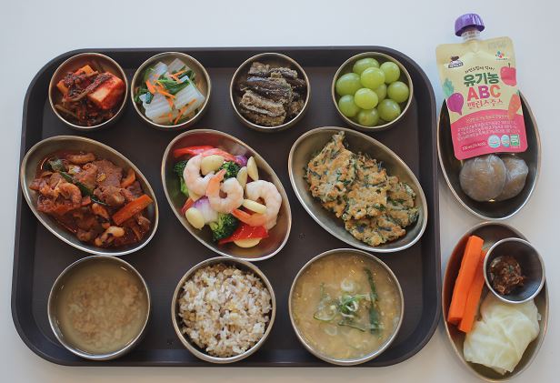 잡곡밥/콩비지찌게/쭈꾸미제육불고기/새우팟타이/야채전/ 창포묵무침/가지들깨나물/숙쌈*야채스틱/김치/샤인머스캣 간식-유기농ABC쥬스/감자떡