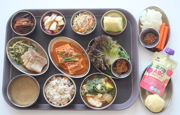 잡곡밥/동태매운탕/삼겹살수육*파채무침/참치두부조림/모듬쌈채/ 숙쌈*야채스틱/유부숙주나물/양파간장절임/갓김치/메론 간식-찐감자/유기농ABC쥬스